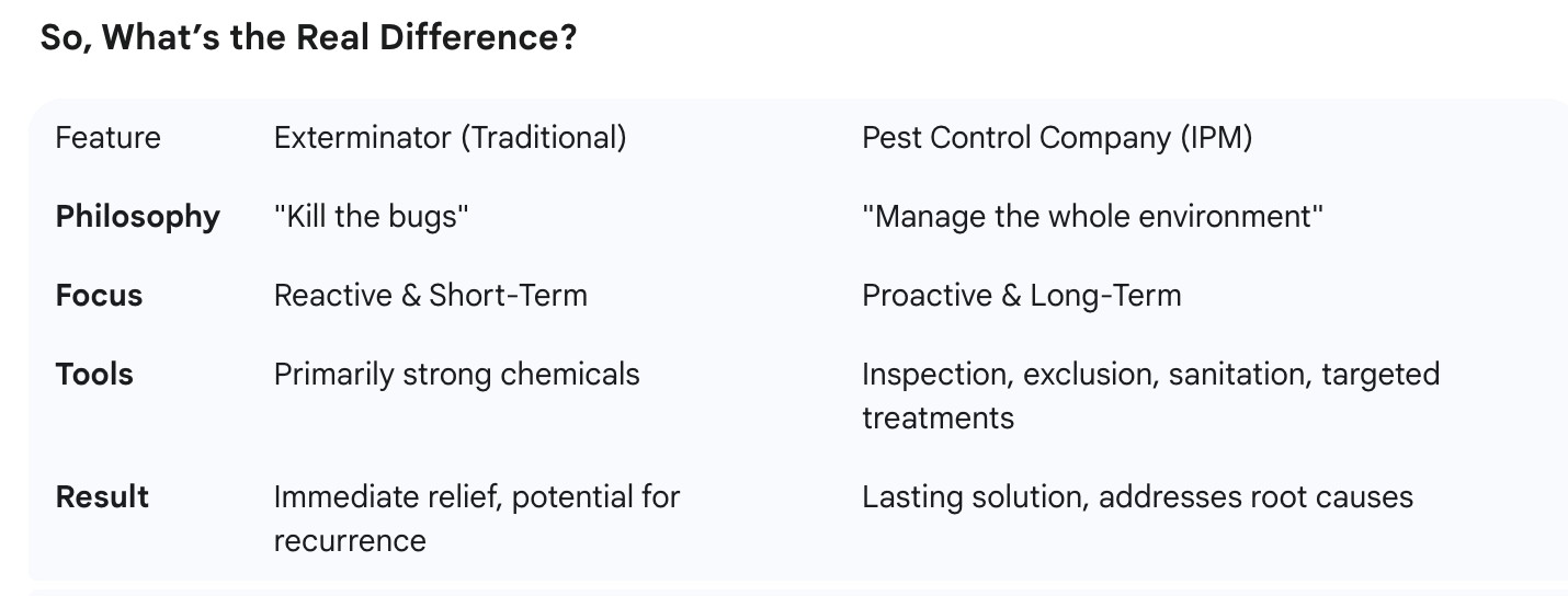 FeatureExterminator (Traditional)Pest Control Company (IPM)Philosophy"Kill the bugs""Manage the whole environment"FocusReactive & Short-TermProactive & Long-TermToolsPrimarily strong chemicalsInspection, exclusion, sanitation, targeted treatmentsResultImmediate relief, potential for recurrenceLasting solution, addresses root causes